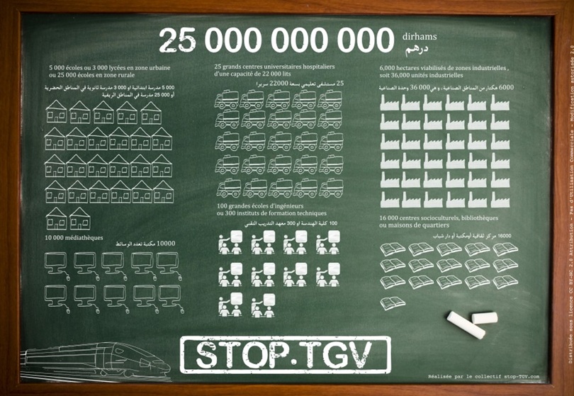 Un collectif d’associations a, sous le nom de StopTGV, lancé une campagne et une pétition. Le collectif tient à rappeler un élément important : le budget d’investissement, non sans prendre en compte des déficits prévisibles d’exploitation, s’élevait à quelques 25 milliards de dirhams (soit 2.25 milliards d’euros). Mais au-delà du coût extravagant du projet, le collectif s’indigne également du manque cruel d’information, de transparence et de concertation. Alors qu’à l’époque où le PJD était encore dans l’opposition, quelques députés de ce parti osaient remettre en question ce projet, nous assistons aujourd’hui à un silence assourdissant du PJD sur ce TGV au coût faramineux. Pire encore, il n’est question d’aucun débat public, hormis une campagne pro-TGV où la pensée unique régira naturellement le discours. On peut facilement en déduire que le projet TGV est tout simplement un chantier qui n’entre effectivement pas dans les prérogatives du gouvernement et que toute prise de décision le concernant relève des hautes sphères du palais, détenteur du véritable pouvoir.
