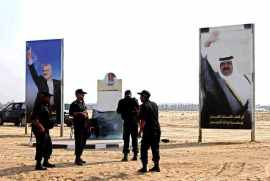 Des forces de sécurité du Hamas palestinien devant des affiches du premier ministre du Hamas Ismail Haniya (à gauche) et de l’Emir du Qatar